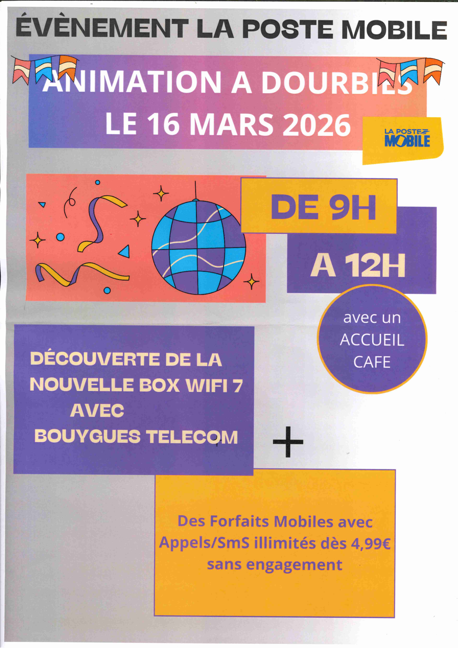 La poste mobile vient vous proposer son offre avantageuse de forfaits télécom et box internet à la salle des associations lundi 16 mars de 09h à 12h.