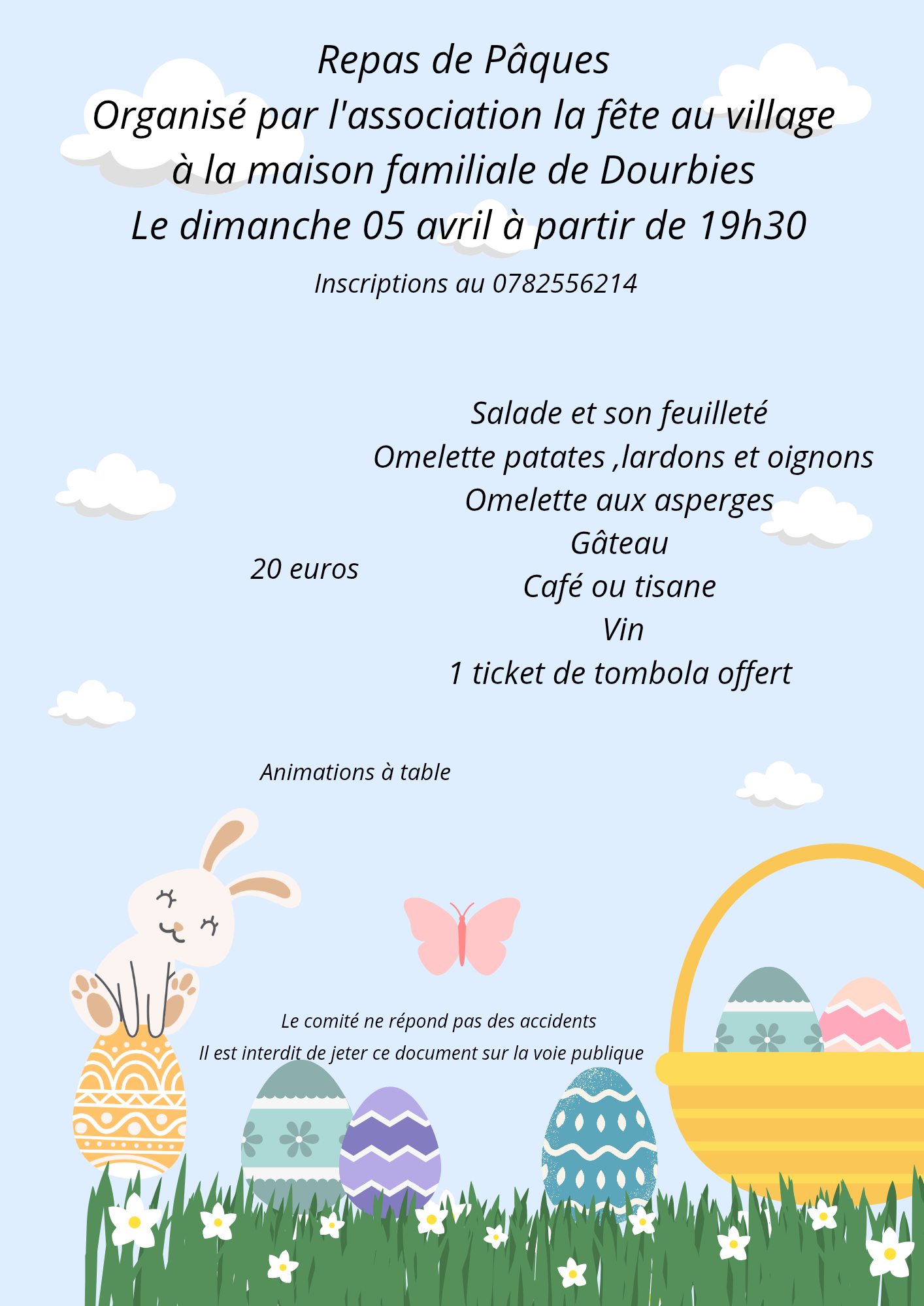 L’association la fête au village vous convie à son repas de Pâques qui aura lieu à la Maison Familiale le 05 avril 2026 à partir de 19h30.