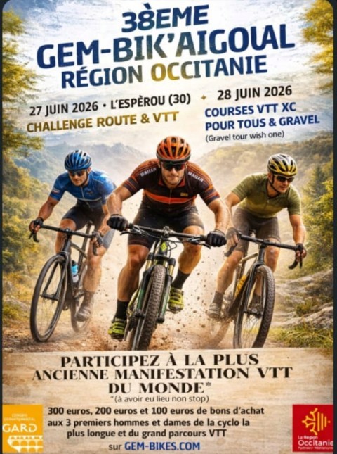 La Gem Bike Aigoual aura lieu les 27 et 28 juin 2026 avec le Challenge route et VTT suivi de courses VTT XC pour tous et Gravel.