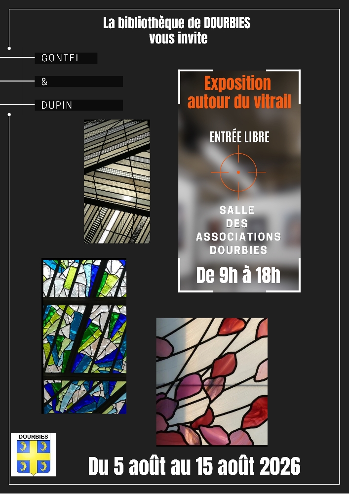 La bibliothèque de Dourbies vous propose une exposition autour du vitrail du 05 au 15 août à la salle des associations de 09h à 18h.