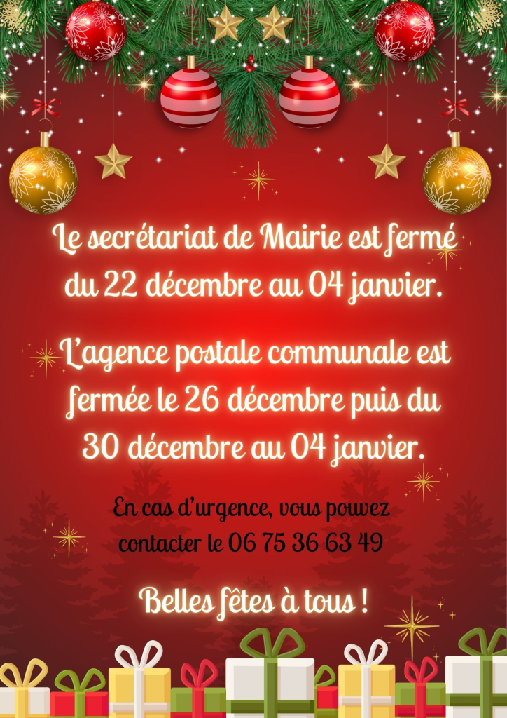 Le secrétariat de maire est fermé du lundi 22 décembre au dimanche 04 janvier.